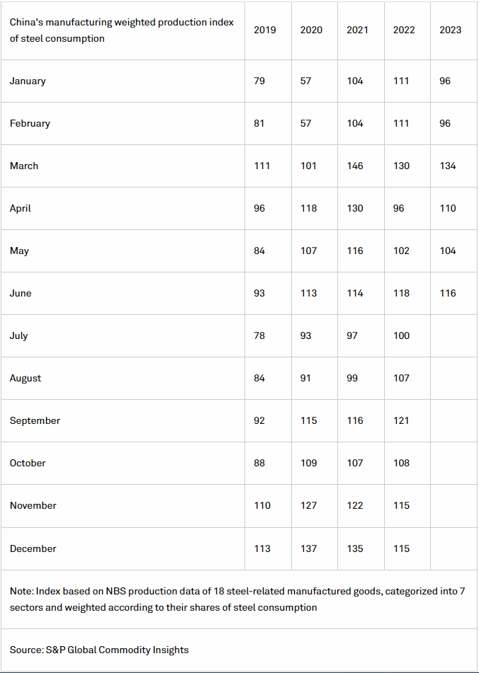 China’s manufacturing production index for steel consumption, produced by S&P Global, was at 116 points for June, up from 104 points in May, but still lower than the year-ago 118 points.