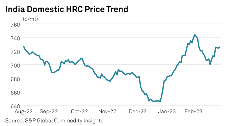 Platts assessed domestic HRC of 2.5-10 mm thickness at Rupee 59,500/mt ex-works Mumbai March 27, showed data from S&P Global Commodity Insights.