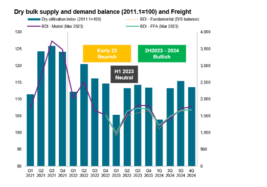 Since discussed in the last edition, over the last three months, our dry bulk freight forecasting models continued to show bearish view for early 2023 and bullish view for the second half of 2023 onward. Interestingly, we observed a volatile path to lower rates over the past few months in the absence of high congestion and slower-than-expected economic growth with continued weakness in mainland China’s real estate sector. However, deferred contract of FFA, specifically, assessments for the second half of 2023 onward have been well-supported with mainland China’s policy shifting toward supporting economic growth. As of writing (March 7, 2023), sentiments changed rapidly as many expect that major change in mainland China’s “zero-COVID” policy would eventually improve the fundamental. We maintain our positive view in the medium term (first half 2023 onward) but remain cautious on very near term, mostly Q2 2023 for dry bulk market.