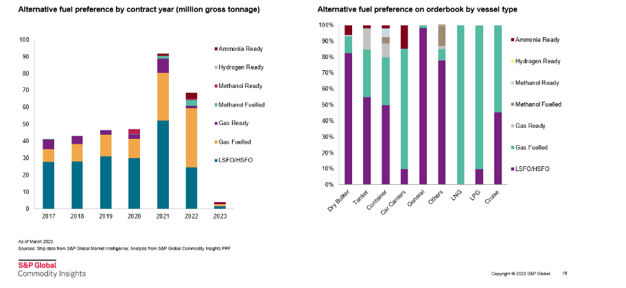 Although methanol (green) started to gain attention recently, mostly from container sector, gas has been the preferred choice for alternative fuel including dry bulk sector, while conventional LSFO-HSFO with scrubbers are still the dominant type for dry bulkers.
