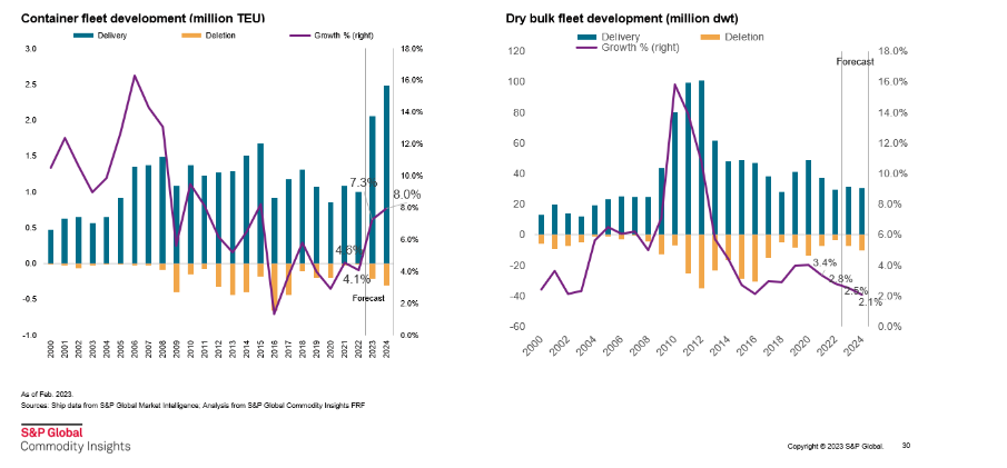 - With limited orderbook, annual dry bulk fleet growth will slow to 2.8% in 2022, 2.5% in 2023, and 2.1% in 2024, compared with 3.4% in 2021, while container fleet growth will increase to 7.3% in 2023 and 8.0% in 2024, downgraded from previous expectation with higher scrap and slippage owing to reduced earning expectation.