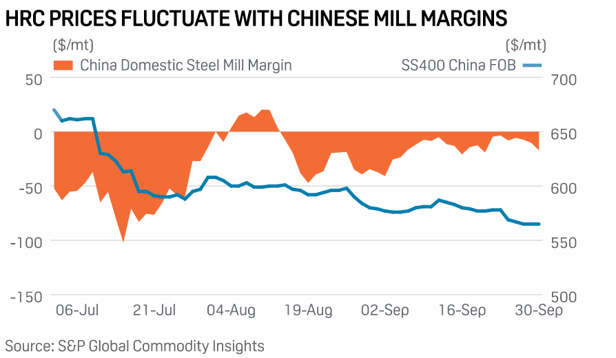 Steel mills saw mostly negative margins throughout Q3 and their average is estimated to fall to minus $28.4/mt, from minus $16.4/mt in Q2, according to data from S&P Global Commodity Insights. A high production cost has also meant that mills are unwilling to lower export offers.